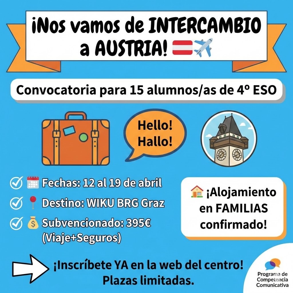 El IES HUERTA ALTA tiene el placer de convocar al alumnado de 4º de ESO para participar en un intercambio escolar con el centro WIKU BRG Graz (Austria), enmarcado en el Programa de Competencia Comunicativa en Enseñanza Bilingüe (Modalidad B), regulado por la Resolución de 10 de noviembre de 2025 de la Dirección General de Innovación y Formación del Profesorado. Gracias a la gestión de nuestros socios en el centro de destino, el alojamiento y la manutención en familias de acogida está, de momento, confirmado para todos los participantes.